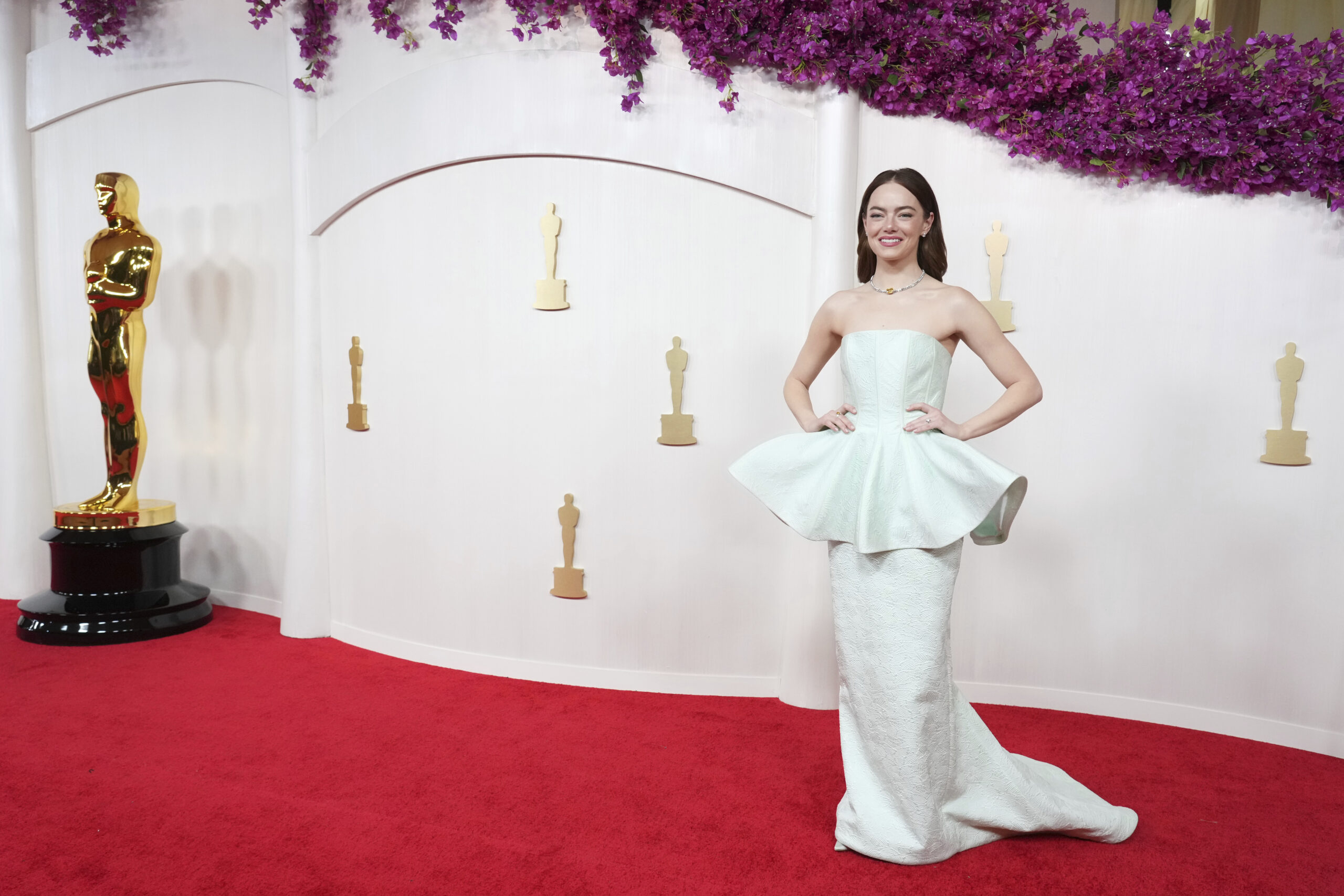 Novità effettiva di questa edizione degli Oscar 2024 sono state le nuance scelte. Rispetto al classico nero, sempre presente e spesso con effetti indiscutibili, ha fatto il suo ingresso il color pastello in diverse gradazioni ed intensità. Rappresentante più elegante di questa tendenza è, sicuramente, Emma Stone, fresca del suo secondo Oscar come miglior attrice protagonista per Povere Creature. In questo caso la scelta è caduta su un modello costum di Louis Vuitton. La storica maison francese, dunque, ha realizzato un modello unico per l’attrice traendo ispirazione, in qualche modo, dal personaggio di Bella Baxter. In questo caso, però, i volumi cambiano decisamente rispetto ai costumi di scena e agli autisti scelti dalla Stone durante le altre premiazioni cui ha presenziato.